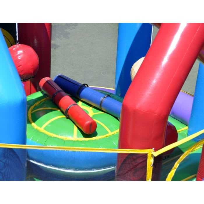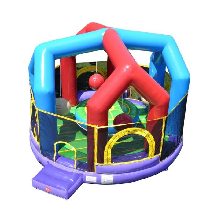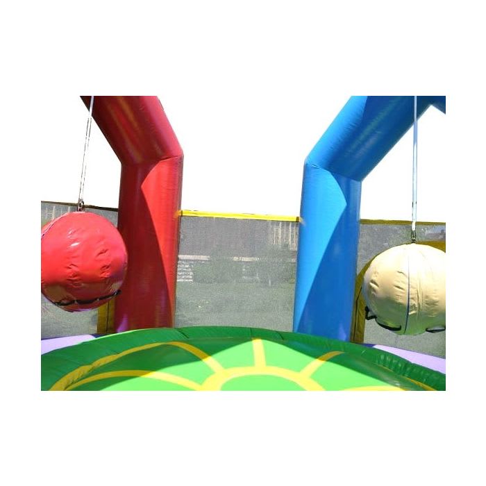 Can you survive the Wrecking Ball? This interactive inflatable is an extreme challenge of agility and stamina. One person stands on the inflatable pedestal in the center of the game while up to four people swing the wrecking balls at them. You must try to duck and dodge the wrecking balls or withstand the blows all while trying to remain upright. Find out who can stand the longest inside the Wrecking Ball game. This is a great multiplayer game for all kinds of outdoor events and parties.